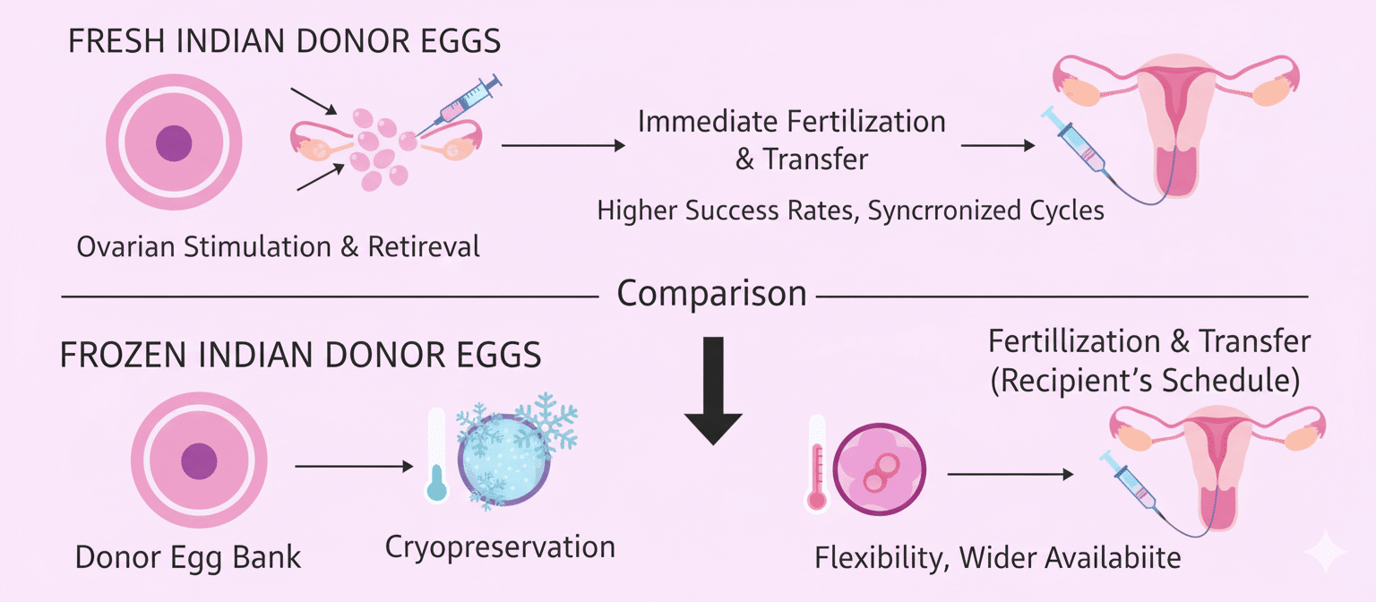 Both fresh and frozen Indian donor eggs offer pathways to parenthood, but the best choice depends on your family goals, timeline, and budget. For Indian intended parents, fresh cycles remain the most popular due to success rates and sibling options.